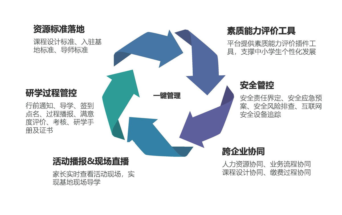 規範研學旅行(xíng)業務全流程線上(shàng)化管理(lǐ),活動報名、信息收集、自動分組、研學手冊,播報、電(diàn)子證書(shū)、試題等,促進研學旅行(xíng)行(xíng)業服務數(shù)字化升級。